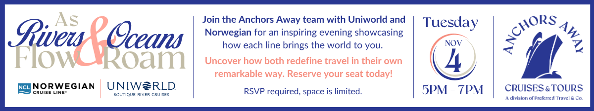 Join your Anchors Away team and representatives of both Norwegian Cruises Lines and Uniworld Boutique River Cruises. The evening will showcase how each cruise line brings the world to you.