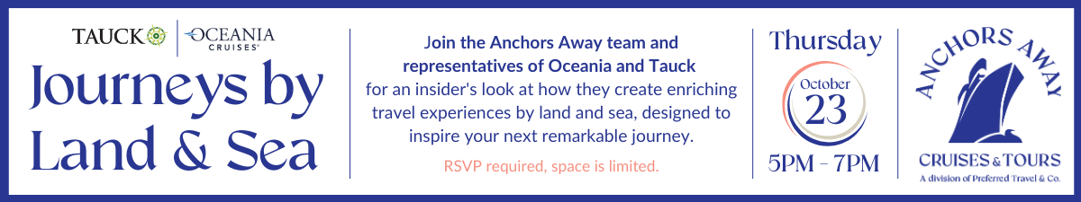 Join your Anchors Away team and representatives of both Oceania and Tauck for an insider's look at how they create enriching travel experiences by land and sea, designed to inspire your next remarkable journey.