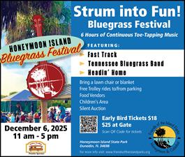 Join us for a day of music and fun at the Honeymoon Island Bluegrass Festival on December 6, 2025. For more information and to purchase tickets, visit www.friendsoftheislandparks.org.